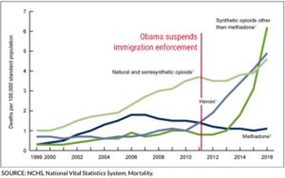 Notice when the dip in apprehensions began and how they have still not recovered from Obama’s suspension of the rule of law. This coincided directly with the rise of the drug epidemic.