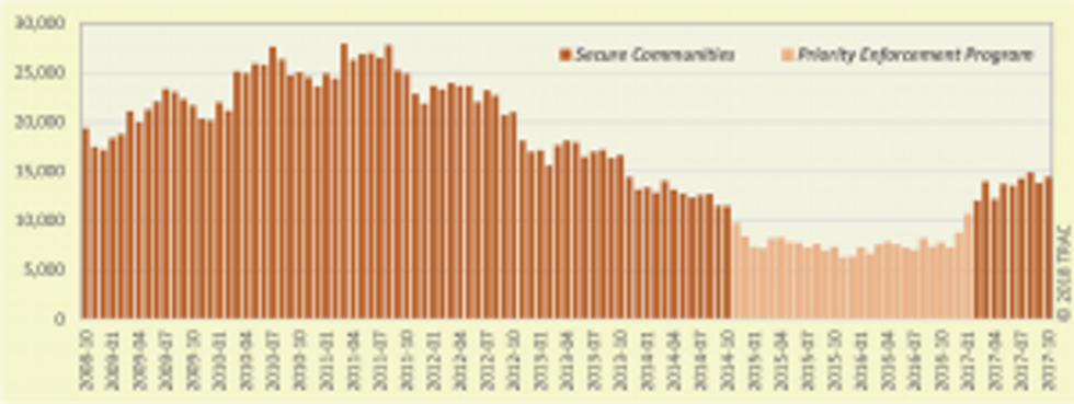 On the flip side, there was a surge in releases by immigration judges beginning around the same time as DACA and the suspension of the 287(g) program. The percentage of immigration cases that resulted in release by immigration judges surged from 30 percent to over 50 percent during this period. In some of the big trafficking hubs like New York and Boston, those numbers surged past 80 percent.