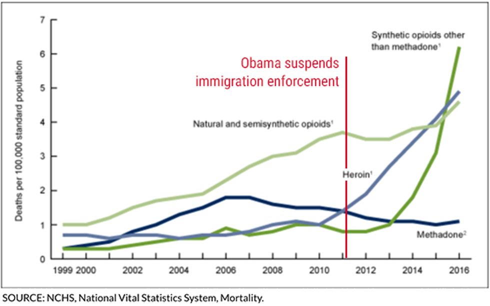 We’ve always had drugs flowing into this country. But the supply and dangerous nature of the drugs coming into this country from Mexico (or from China and then distributed by the Mexican cartels) since 2013-2014 are at an epidemic level, dwarfing anything we’ve seen before. It all began with the suspension of immigration enforcement from 2010-2014 and suspension of interior enforcement. Transnational drug cartels worked with gangs and human smugglers to take advantage of Obama’s unprecedented dismantling of our borders in order to launch what should be described as chemical warfare on this country. If you read former senator and now Attorney General Jeff Sessions’ timeline on Obama’s dismantling of immigration security and border control, the timing of the drug crisis makes perfect sense.