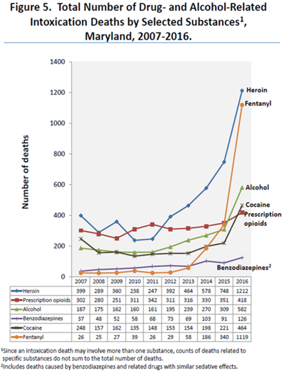Maryland is one of the crisis states, with drug deaths quadrupling over the past five years, even as prescription opioid rates have dropped well below the national average. This one chart from the Maryland Department of Health is worth 1,000 words: