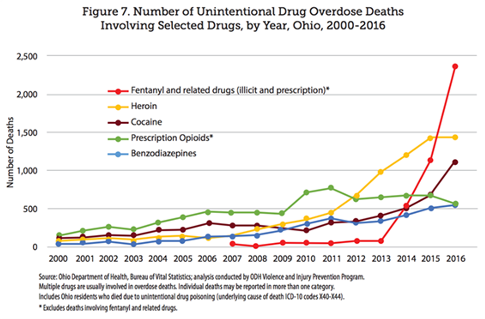 The epidemic we are facing today is not from prescription opioids, at least not more than it has been for an entire generation. The number of prescriptions has already been reduced dramatically, and the overdose rate has leveled off and even dropped in some of the most affected states since 2016, like Ohio. Almost the entirety of the increased fatalities above the long-term existing trajectory beginning in 2012 were from illicit drugs and mainly from the most dangerous one – heroin. Then, as heroin use began to skyrocket in 2013-2014, we began to see the growth of the cursed synthetic drug – fentanyl – which is 50-100 times stronger than morphine and can kill in small quantities. It’s often laced into heroin. In pretty much every state, fentanyl has skyrocketed to such a level that it has overtaken heroin as the leading drug killer. Cocaine and meth overdoses have also gone up a lot but are not nearly as serious.