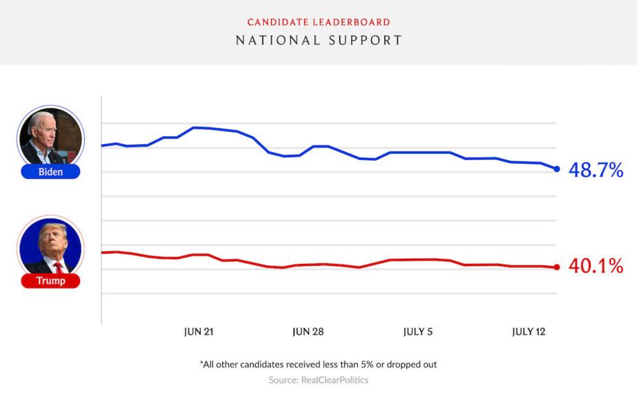 On May 18, Real Clear Politics’ average of the major national polls showed Trump facing a 4.7% deficit (48.6-43.9). A month later, the gap had doubled to 9.5, with Biden edging above the 50% mark. Now, another month later, the gap has slightly diminished, but it’s still sizeable. Trump currently trails Biden by an average of 8.6% (48.7–40.1).