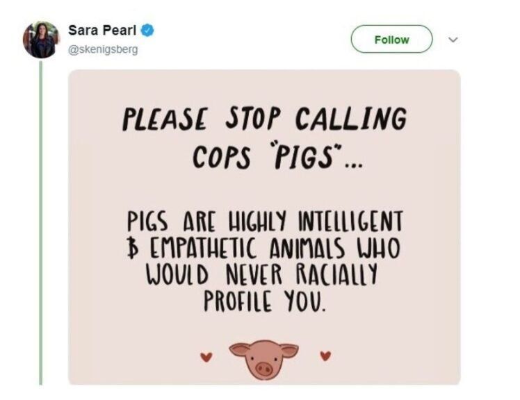 Sara Pearl also retweeted a user’s comment that while “pigs are sweet, intelligent and compassionate,” police officers are “monsters” who “don’t deserve to be called pigs,” Fox News noted.