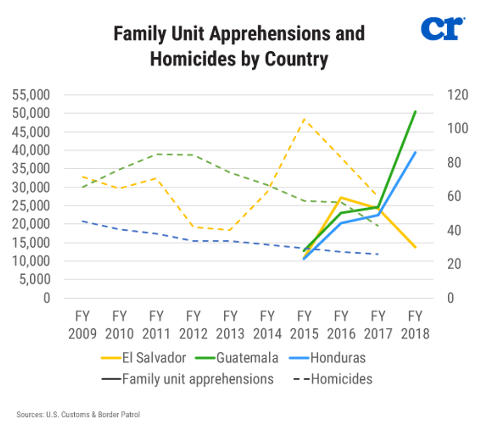 As you can see, the rise and fall of family units migrating from Central America is inverse to the homicide rates in those countries.