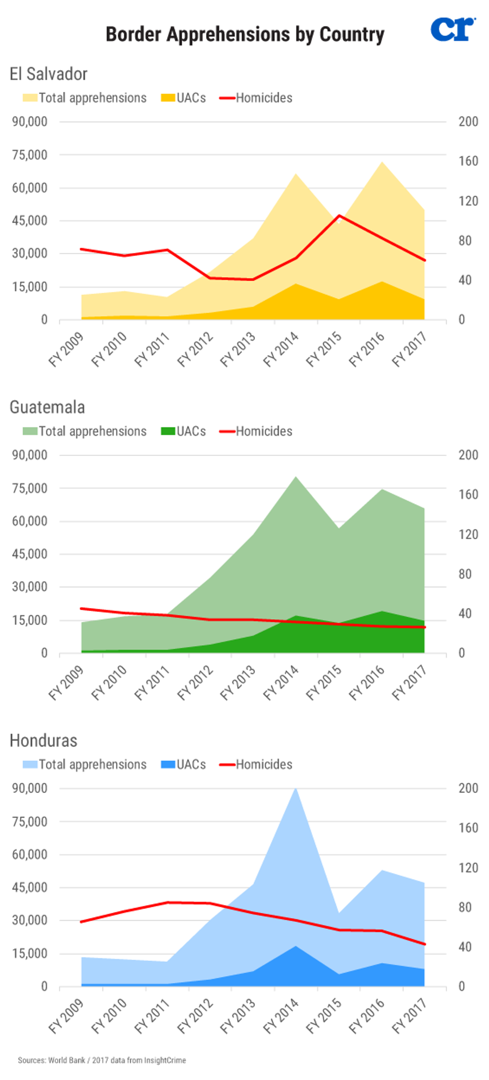 The numbers are even starker when you look at the individual countries. El Salvador, by far, has the highest rate of homicide relative to the other Central American countries. Honduras is in the middle, and Guatemala is relatively the least violent of the three. Yet the migration trends are flipped.