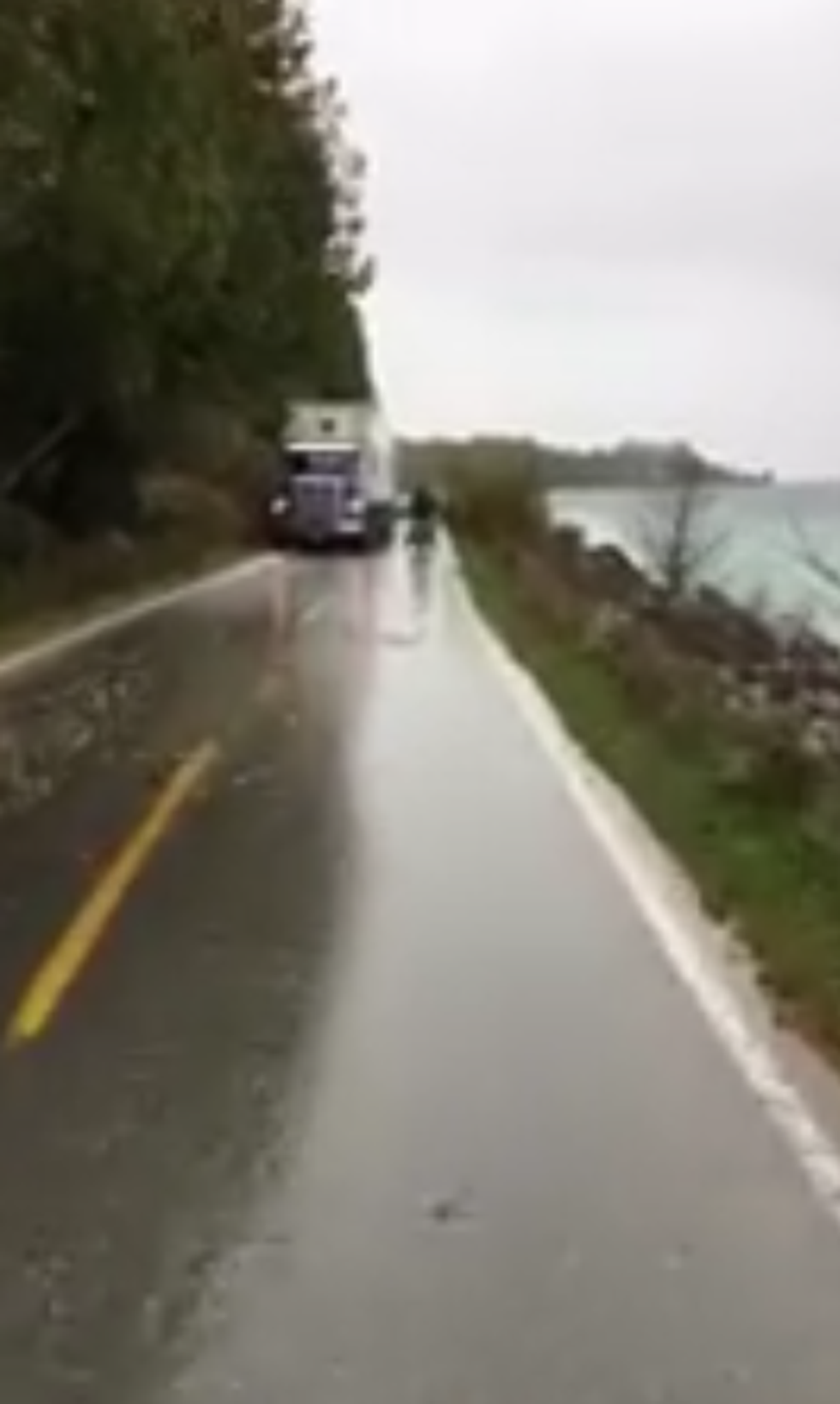 That’s a semi on M-185, the highway that circles the island, as shown in this video by Aaron Glenn Miller.
