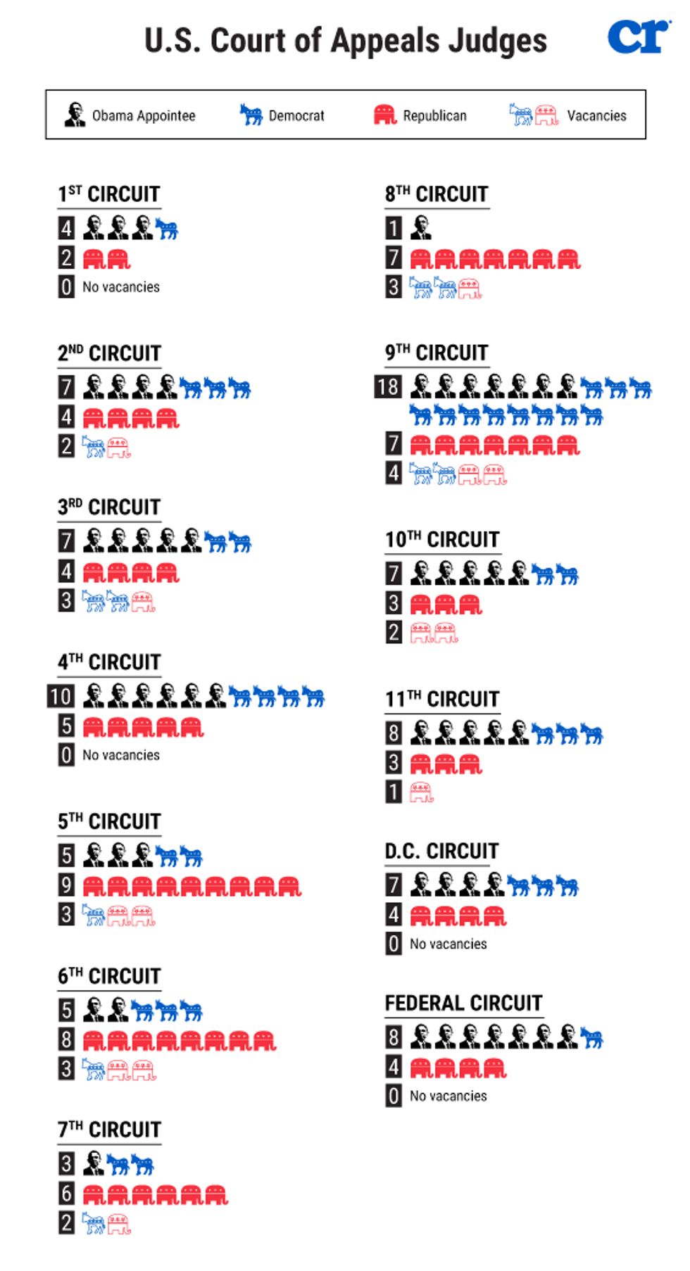 Moreover, a great deal of other vacancies will come from states with at least one, if not two, Democrat senators. We posted a full circuit-by-circuit analysis in February, demonstrating Trump’s limited ability to fundamentally alter a circuit the way Obama did with the Fourth, 10th, 11th, and D.C. Circuits.