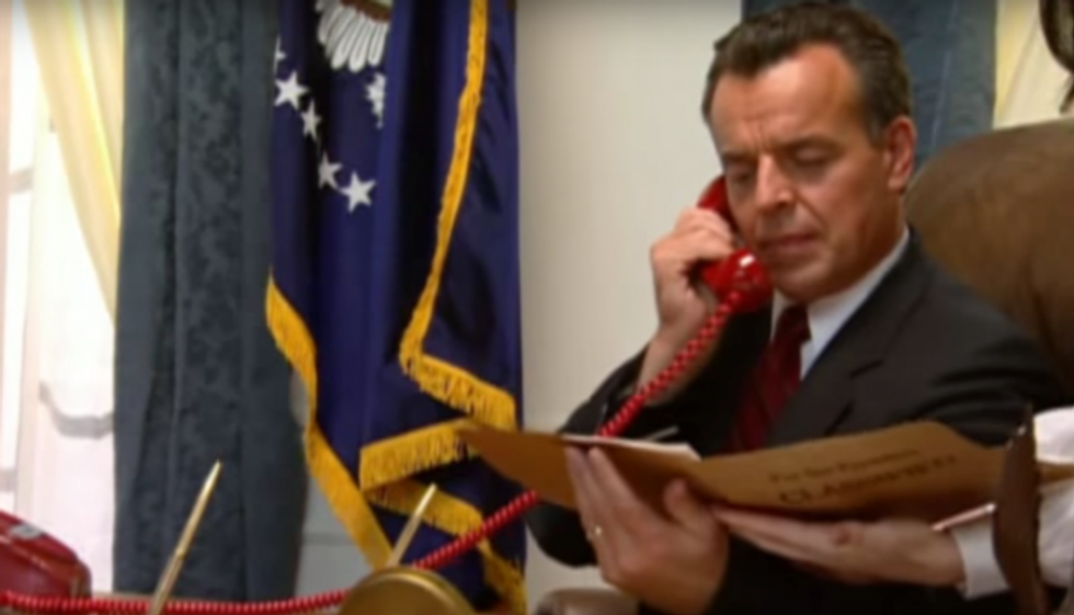 Quote: "We're for freedom of speech everywhere. We're for freedom to worship everywhere. We're for freedom to learn... for everybody. And because in our time, you can build a bomb in your country and bring it to my country, what goes on in your country is very much my business. And so we are for freedom from tyranny, everywhere, whether in the guise of political oppression, Toby, or economic slavery, Josh, or religious fanaticism, C.J. That most fundamental idea cannot be met with merely our support. It has to be met with our strength. Diplomatically, economically, materially. And, if Pharaoh still don't free the slaves, then he gets the plagues or my cavalry, whichever gets there first."