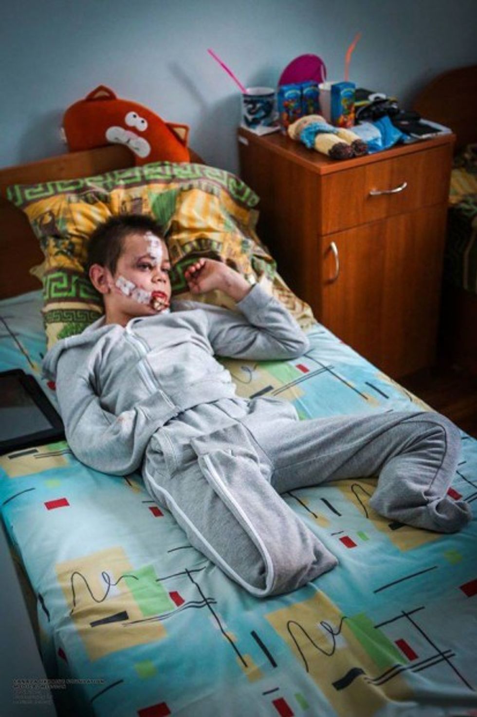 When I walked into the room, there was Mykola, lying in bed, with no legs. He looked up at me, and after our eyes met, he abruptly turned away, curled up into a ball and cried. His mother tried to console him, but he kept crying. I asked all but the medical staff and the translator to leave the room.