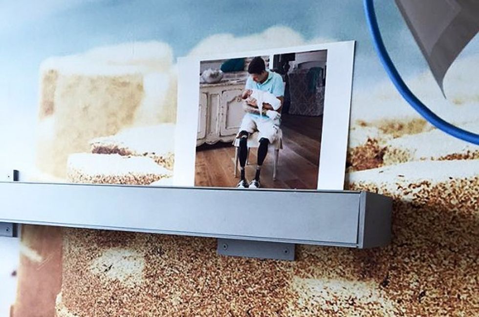 Articles about him began appearing around the world. In one of them, a media reporter asked Mykola about a photo he had above his bed. It was a photo of another triple amputee holding his newborn son. Mykola explained to them that the photo was of an American soldier injured in a war. He said, “This is my hero. I want to be like him."