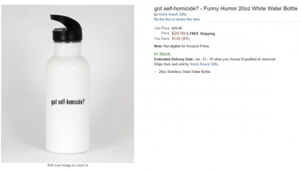 In all fairness, Amazon removed the offensive "Got Suicide" mug in response to the boycott petition. Yet the same vendors continue to sell the trafficking mug, and a "Got Self-Homicide?" 20-ounce white water bottle.