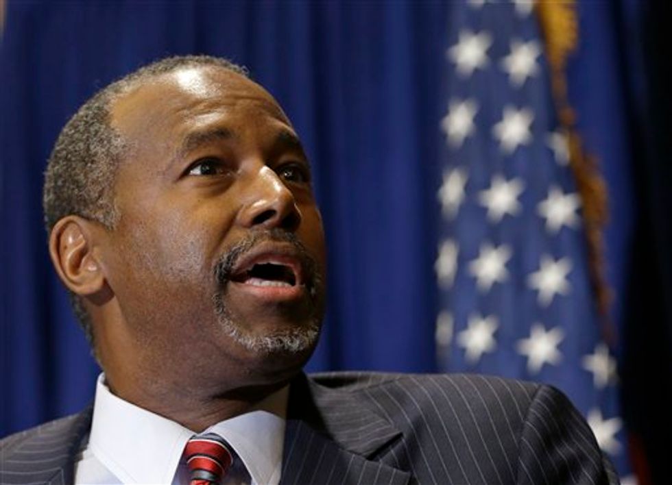 Republican presidential candidate Ben Carson speaks to reporters during a news conference before the Black Republican Caucus of S. Florida "Diamonds & Ice" Scholarship gala, Friday, Nov. 6, 2015, in Palm Beach Gardens, Fla. (AP/Alan Diaz)