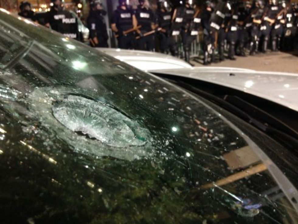 A police vehicle is damaged as police fire teargas as protestors converge on downtown following Tuesday's police shooting of Keith Lamont Scott in Charlotte, N.C., Wednesday, Sept. 21, 2016. (AP Photo/Allen Breed)