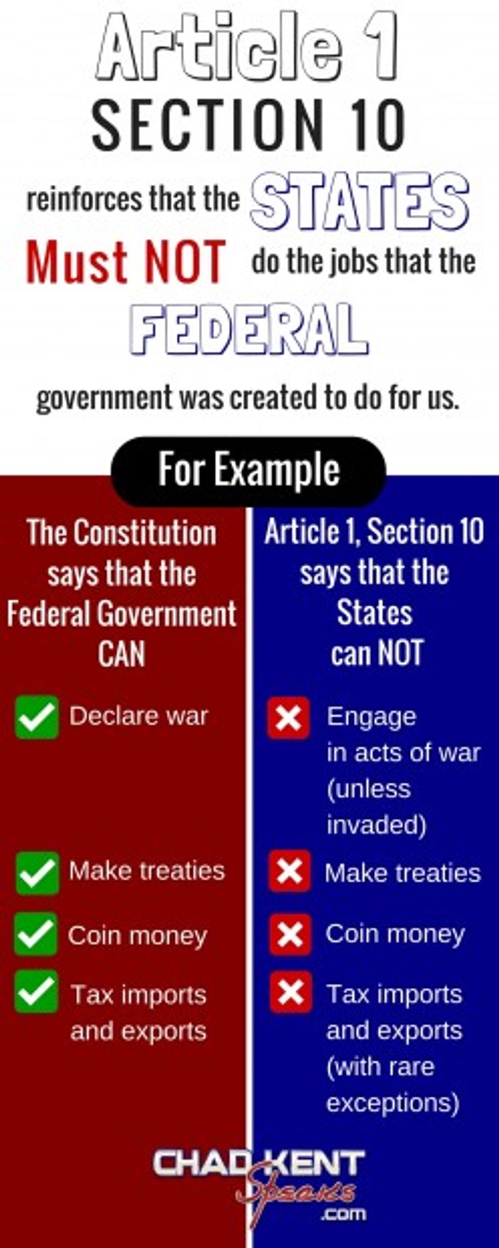 Because of that, the States and the federal government were intended to play very distinct and separate roles in this country. Article 1, Section 10 is a big part of establishing that distinction between the two levels of government. For the most part, it just tells the states that they aren’t allowed to do the jobs that the federal government was created to do for us.