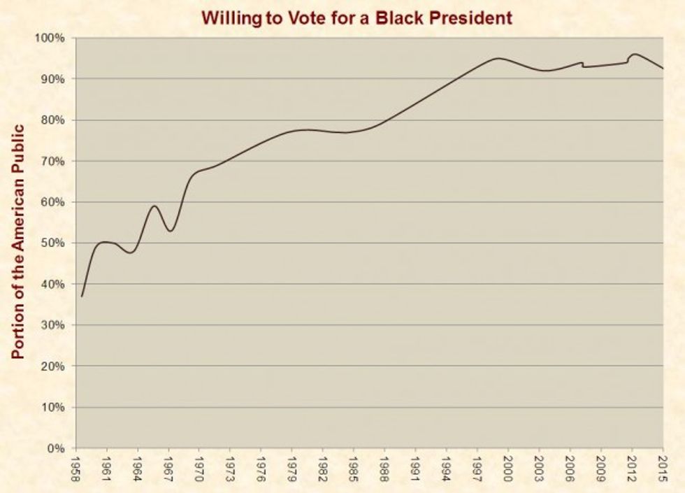 As explained by Gallup, 95 percent is “essentially universal willingness to state to an interviewer that the race of a candidate for president would make no difference.” In fact, the portion of non-white voters willing to vote for a black president is essentially the same—98 percent in 2012 and 93 percent in 2015. These figures are all within the polls’ margins of error.