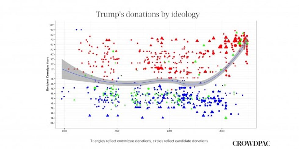Data compiled by CrowdPAC - a new leading resource for objective data on U.S. political campaigns - reveals that Trump's donation lean just as much to the left, as to the right.
