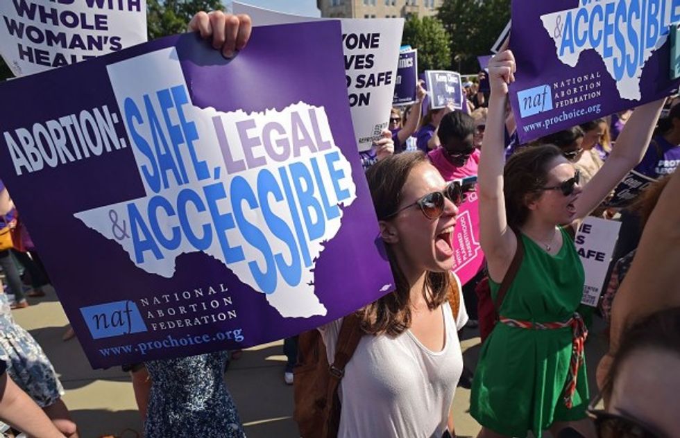 Pro-choice activists hold placards and chant outside of the US Supreme Court ahead of a ruling on abortion clinic restrictions on June 27, 2016 in Washington, DC. (MANDEL NGAN/AFP/Getty Images)