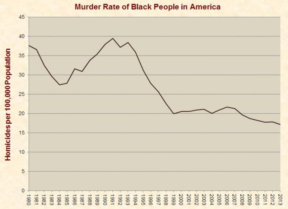 Contrary to the notion that murders of African Americans are increasing, the latest and most comprehensive data on the race of homicide victims show that the murder rate of black people in America has dropped by more than 50 percent since the early 1990s: