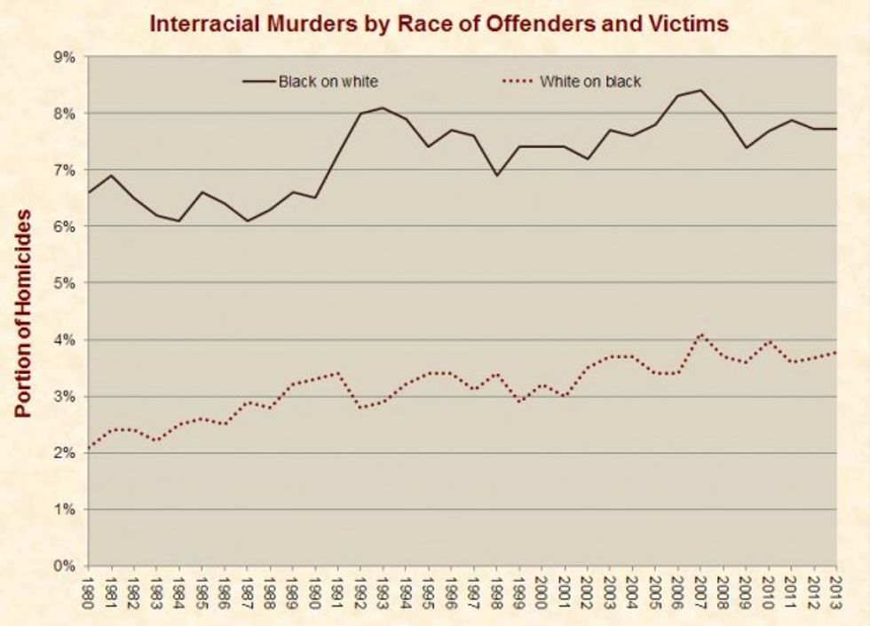Furthermore, the latest and most comprehensive data on interracial murders show that they account for less than 15 percent of all murders, and that black-on-white murders are about twice as common as white-on-black murders: