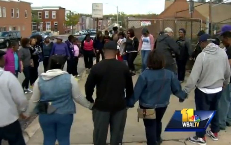 Residents gather in Baltimore for a prayer circle. (WBAL-TV)