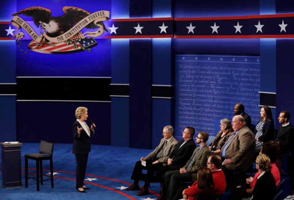 Democratic presidential nominee Hillary Clinton speaks during the second presidential debate with Republican presidential nominee Donald Trump at Washington University in St. Louis, Sunday, Oct. 9, 2016. (AP Photo/Patrick Semansky)