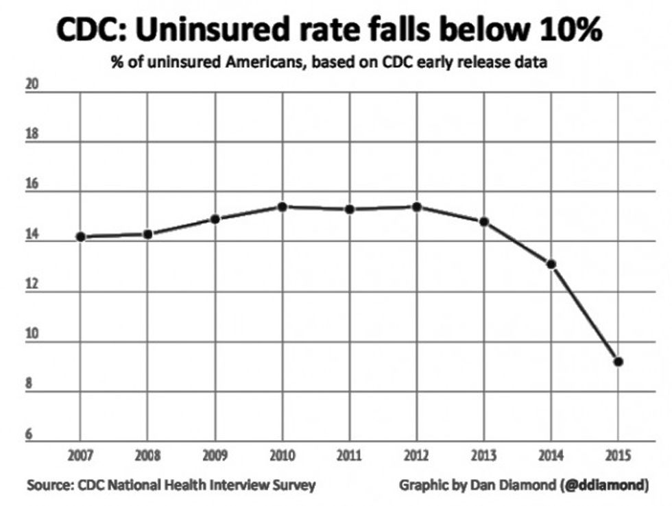 Her big claim is that Obamacare has reduced the number of uninsured Americans - and that is probably true. The numbers are gross estimates and politically spun at that. However, the uninsured rate has fallen from 14.9 percent when Barack Obama took office to 9.6 percent today. This presumably represents 16 million more Americans with health insurance in 2015 than in 2013.