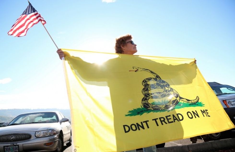 Leslie Corp holds up an American flag and the Gadsden flag while waiting outside of Roseburg Municipal Airport for President Barack Obama's arrival in Roseburg, Ore., Friday, Oct. 9, 2015. (AP Photo/Ryan Kang)