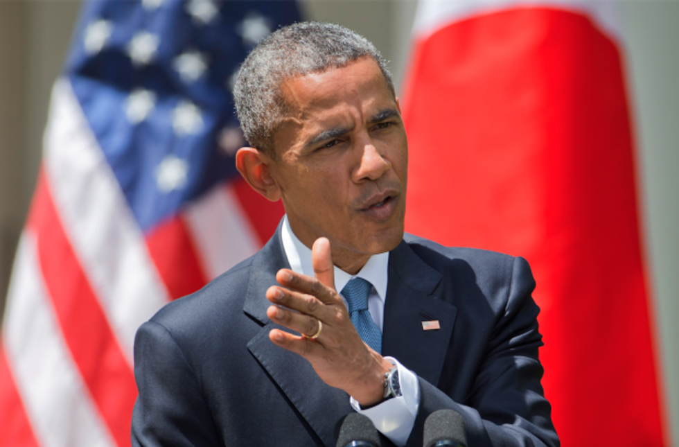 President Barack Obama speaks during a joint news conference with Japanese Prime Minister Shinzo Abe, Tuesday, April 28, 2015, in the Rose Garden of the White House in Washington. (AP Photo/Jacquelyn Martin)