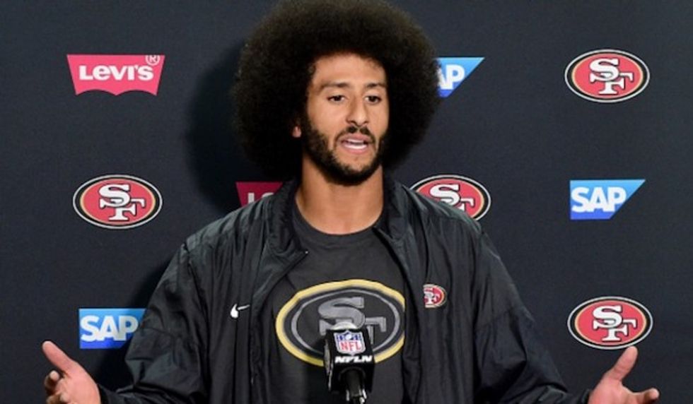Colin Kaepernick #7 of the San Francisco 49ers speaks to media during a press conference after a 31-21 preseason win over the San Diego Chargers at Qualcomm Stadium on September 1, 2016 in San Diego, California. (Photo by Harry How/Getty Images)
