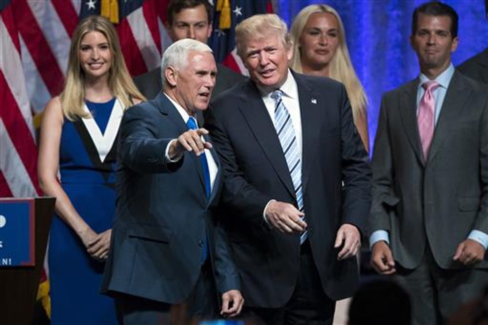 Republican presidential candidate Donald Trump talks with Gov. Mike Pence (R-Ind.) during a campaign event to announce Pence as the vice presidential running mate on, Saturday, July 16, 2016, in New York. (AP Photo/Evan Vucci)
