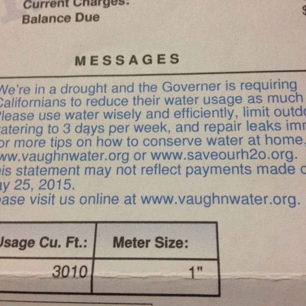 Closer to home, reminders abound on Californians' own water bills including admonishments to customers about rations, fees, and fines. It harkens back to Jimmy Carter-era fuel rationing.
