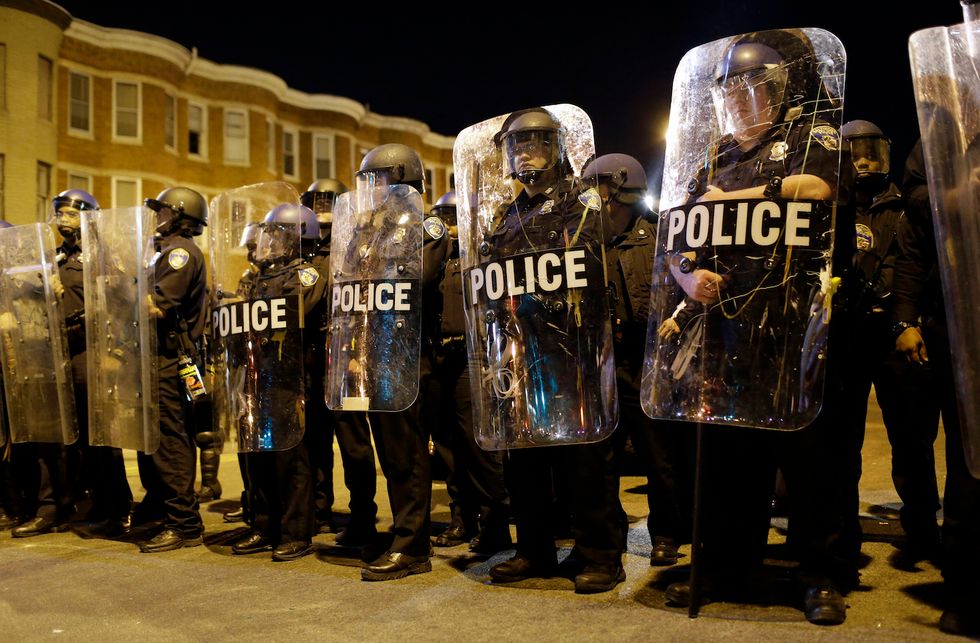 Police stand in formation as a curfew approaches, Tuesday, April 28, 2015, in Baltimore, a day after unrest that occurred following Freddie Gray's funeral. (AP Photo/Patrick Semansky)