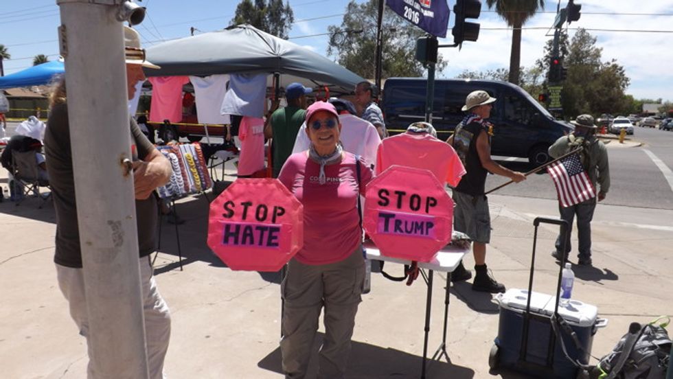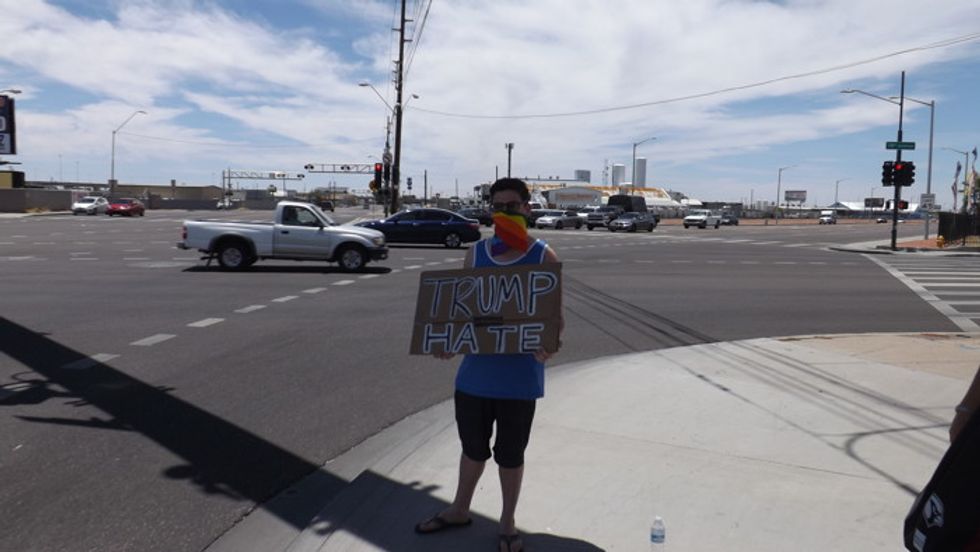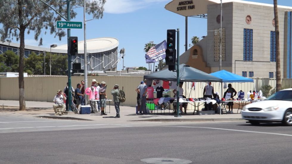 Despite the near record high temperatures in Phoenix, a few early protesters are spotted at a nearby intersection.