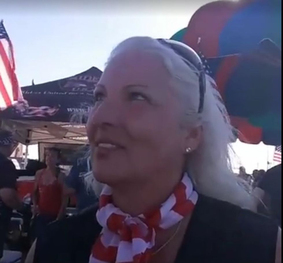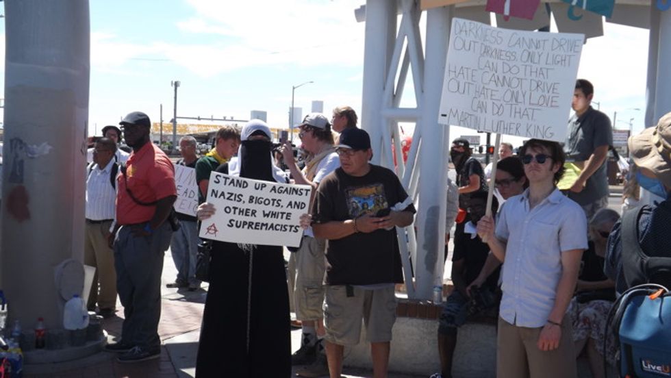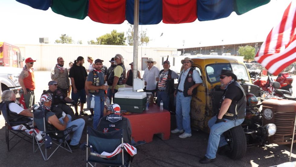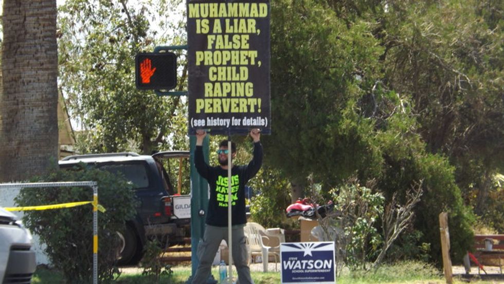 High temperatures and Lions Guard riders did not dissuade all of the protesters. This man holds up an anti-Muslim sign just opposite the entrance to the Arizona fairgrounds.