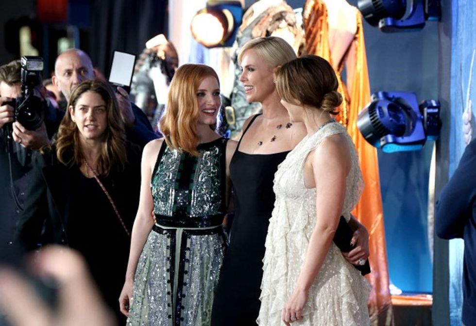 Actresses Jessica Chastain, Charlize Theron and Emily Blunt attend the premiere of Universal Pictures' 'The Huntsman: Winter's War' at the Regency Village Theatre on April 11, 2016 in Westwood, California. (Photo by Frederick M. Brown/Getty Images)