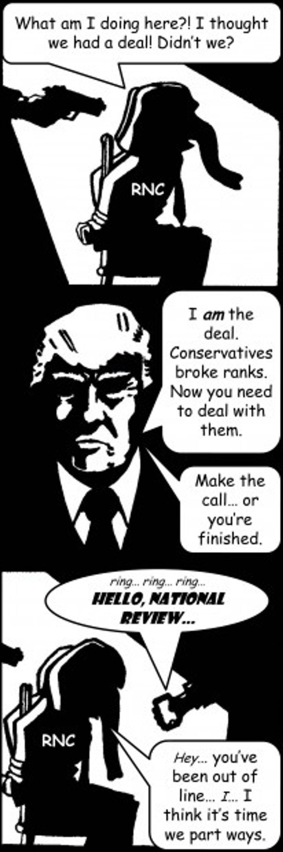 Unfortunately, the establishment may not understand the full extent of their deal with Trump. If he wins the presidency what sort of deals will the candidate be making between Democrats and establishment Republicans? How many more conservative allies will they lose on behalf of these deals? And how will those deals affect the longevity of the RNC?