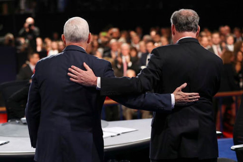 Republican vice-presidential nominee Gov. Mike Pence and Democratic vice-presidential nominee Sen. Tim Kaine stand after the vice-presidential debate at Longwood University in Farmville, Va., Tuesday, Oct. 4, 2016. (Joe Raedle/Pool via AP)