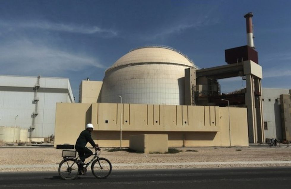 In this Oct. 26, 2010 file photo, a worker rides a bicycle in front of the reactor building of the Bushehr nuclear power plant, just outside the southern city of Bushehr, Iran. (AP Photo/Mehr News Agency, Majid Asgaripour, File)