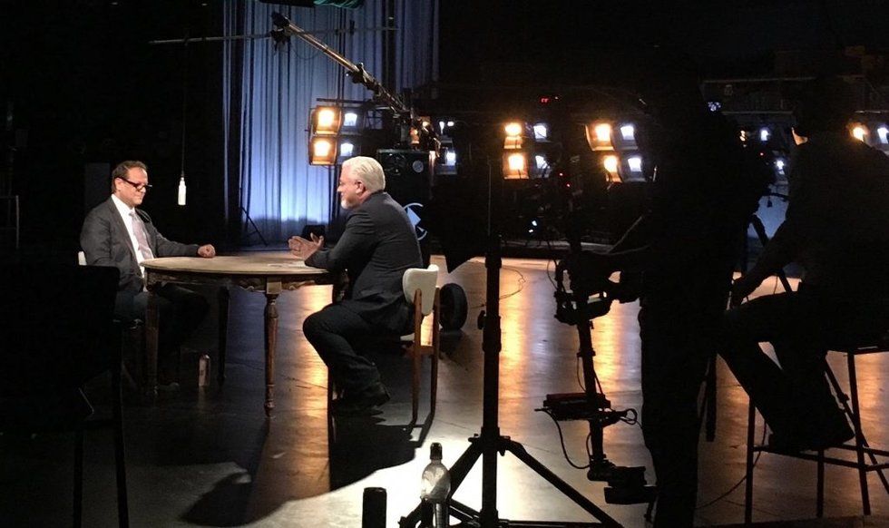 You can feel this energy when you listen to the podcast. Especially the second section, which is raw with emotion. To begin with, the studio where Glen's Podcast is recorded always has a magical feel to it. Even more so for the podcast, with windshield-sized lights spidering down around a near-empty auditorium. Secretly, I enjoy seeing people's reactions to that studio. How they push through the swinging doors and suddenly it's like they're in a planetarium, with unherded stars all spread across the ceiling. Rectenwald was no exception. He looked everywhere for a moment, then made his way to the table. So much space. Three cameramen and a producer, and a couple of us perched on the stage out of frame. In the glare of lights, Rectenwald and Glenn talked about life at a table at the heart of a 10,000 square-foot room.