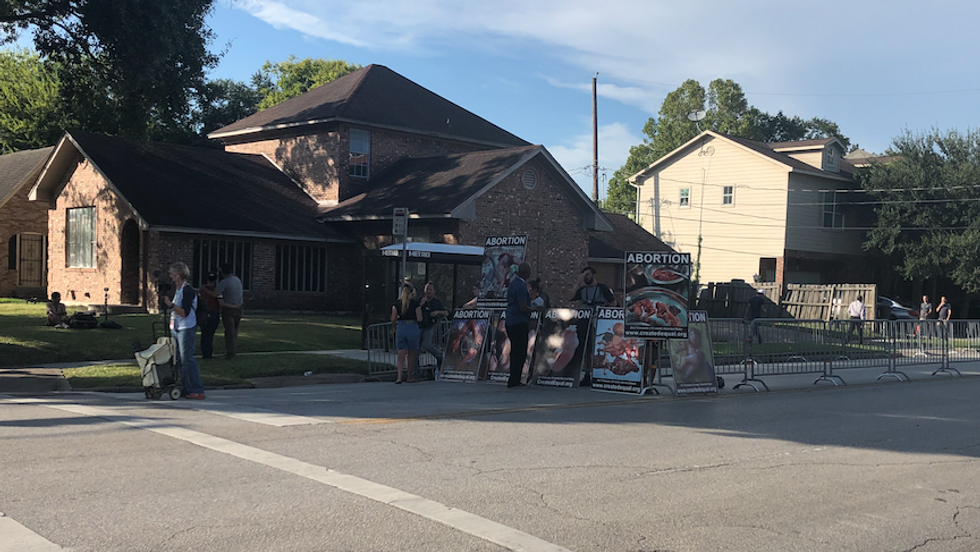 Across the street, facing that horde of supporters, two men gripped pro-life signs.
