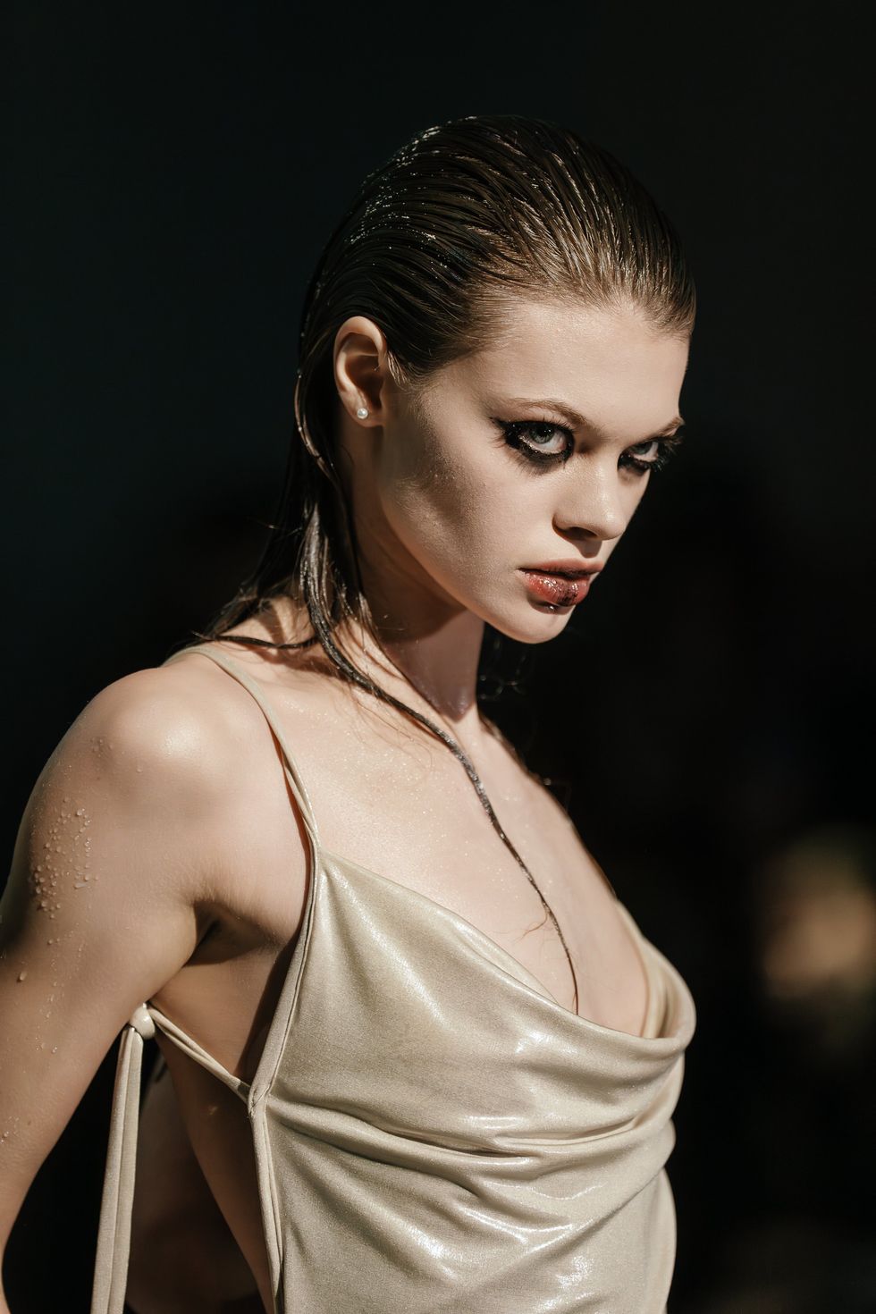 “At the show’s end, the models return in single file to circumnavigate the arena so the audience can have one last look at the designs. Mid-circuit, however, the music abruptly stops. Shrieking, the models fall upon one another in a frenzy of hair-pulling, shoving, wrestling, even animalistic kissing. The sand is revealed to have been a thin veneer covering a mud pit. The models grapple in the filth, which slathers onto their garments, perhaps ruining them. Slowly, they filter off the stage and into the darkness.”