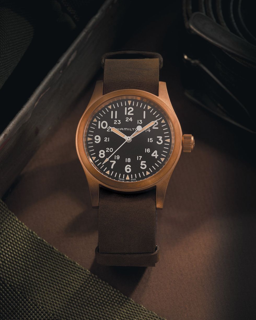 The Hamilton Khaki Field 38mm is my top recommendation for rugged, outdoorsy friends in need of a tough, stylish first watch. It’s durable, versatile, and now available in more dial colors and case treatments than ever. At 9.5mm thick with 50m water resistance, it’s not a dive watch, but it’s certainly capable for hiking, exploring, and even the occasional lake plunge. The bronze case version develops a unique patina over time—perfect for those who view wear as character. The titanium case back ensures durability, while the marbled aging adds personality. If you prefer a cleaner look, opt for stainless steel. Those models maintain their classic, rugged appeal with brushed cases, drilled lug holes, and the same 20mm lug width. It’s a rock-solid, adventure-ready timepiece that only gets better with time.