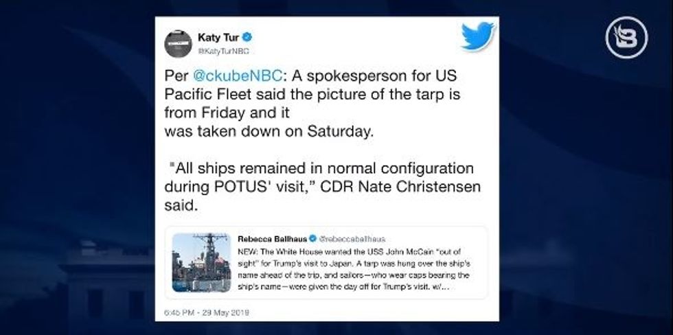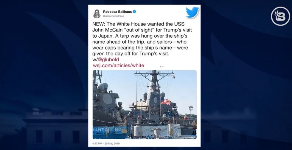 In this clip, Miller explained that Wall Street Journal reporter Rebecca Ballhaus claimed in a tweet that upon Trump's arrival in Japan for a Memorial Day Celebration, the president requested to have a tarp cover the name of the USS John McCain battleship. He went on to explain that the tweet proved to be fake news, but that did not stop the mainstream media from running with the story.