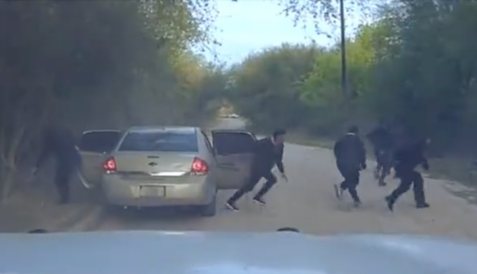 The 15-year-old driver turned off a main road and attempted to evade police through a dirt road, the spokesman said. However, video shows the driver and seven other illegal immigrants bailing out of the vehicle along the dirt road and running toward brush; the clip also shows what appears to be another vehicle further in the distance down the dirt road — presumably another police vehicle — parked sideways and blocking passage.
