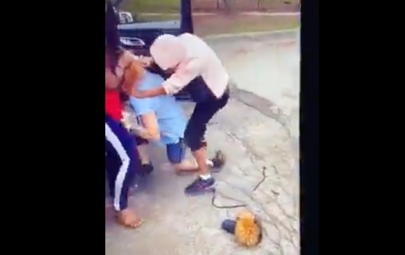 An elderly woman attempts to intervene at one point during the altercation, but she falters out of apparent fear of getting hurt.