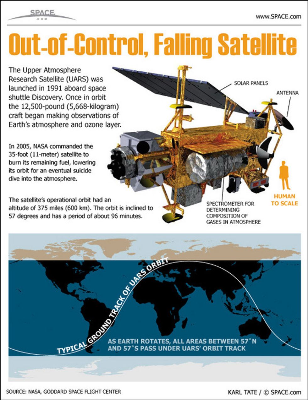 If you live between latitudes 57 degrees north and 57 degrees south -- as far north as Edmonton and Alberta, Canada, and Aberdeen, Scotland, and as far south as Cape Horn, the southernmost tip of South America -- you could see a piece of UARS, the Upper Atmosphere Research Satellite. Every continent but Antarctica is in the strike zone.