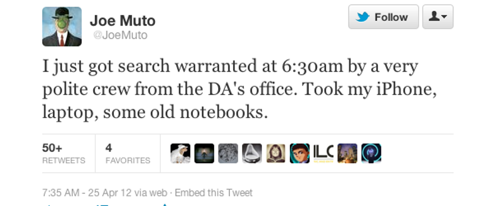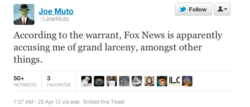 Remember Joe Muto, the disgruntled Fox News employee who leaked a couple of on-set videos from shows like Hannity and the O'Reilly factor, none of which brought any particularly interesting revelations to light? Well, apparently Fox News is set on making an example of him, minor revelations or no. To that end, if Muto's Twitter feed is to be believed, they've pressed charges for grand larceny - a felony charge usually reserved for acts like stealing cars. Business Insider caught Muto's updates to his Twitter:
