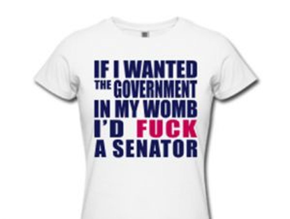 The woman boarded her first flight just fine, wearing a T-shirt that read, "If I wanted the government in my womb, I'd fuck a senator." (The shirt was made in response to a signthat an Oklahoma lawmaker made earlier this year to protest a proposed law granting rights to fertilized eggs.) But as the woman was about to deboard to switch to her next flight, a flight attendant approached her and told her that she needed to talk to the captain because her T-shirt was "offensive."