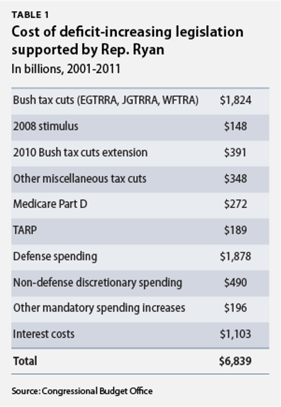 Explanation: In a blog post written by a ThinkProgress intern, Ryan is accused of voting for bills that increase the budget deficit by $6.8 trillion. How do they get this number? By adding up the cumulative cost of all tax cuts that Paul Ryan voted for ($2.5 trillion), as well as "every bill that increased defense spending," which has supposedly increased the deficit by $1.9 trillion. This only comes to $4.4 trillion, but ThinkProgress explains the rest using this table: