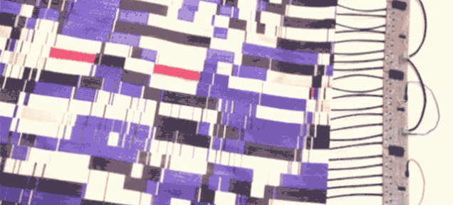 "The dynamic changes in the textile color derive from processed sound files," the Chromosonic Vimeo page explains. "Silkscreen was used to cover the textile in a dye that changes with temperature. Sound makes the nichrome wires woven into the fabric heat up, changing the pattern."